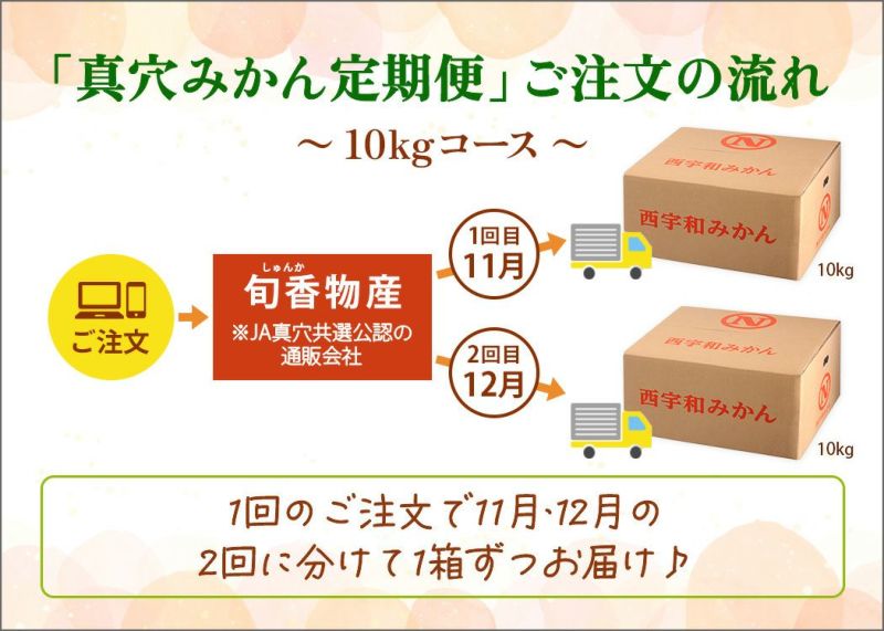 おいしい愛媛の『真穴みかん定期便』は、1回のご注文で、11月と12月の各月に1箱ずつ(計2箱)を同じご住所にお届けする、お得なコースです。 毎月届くたびに箱を開けるのが楽しみになる、旬の味わいを詰め込みました。